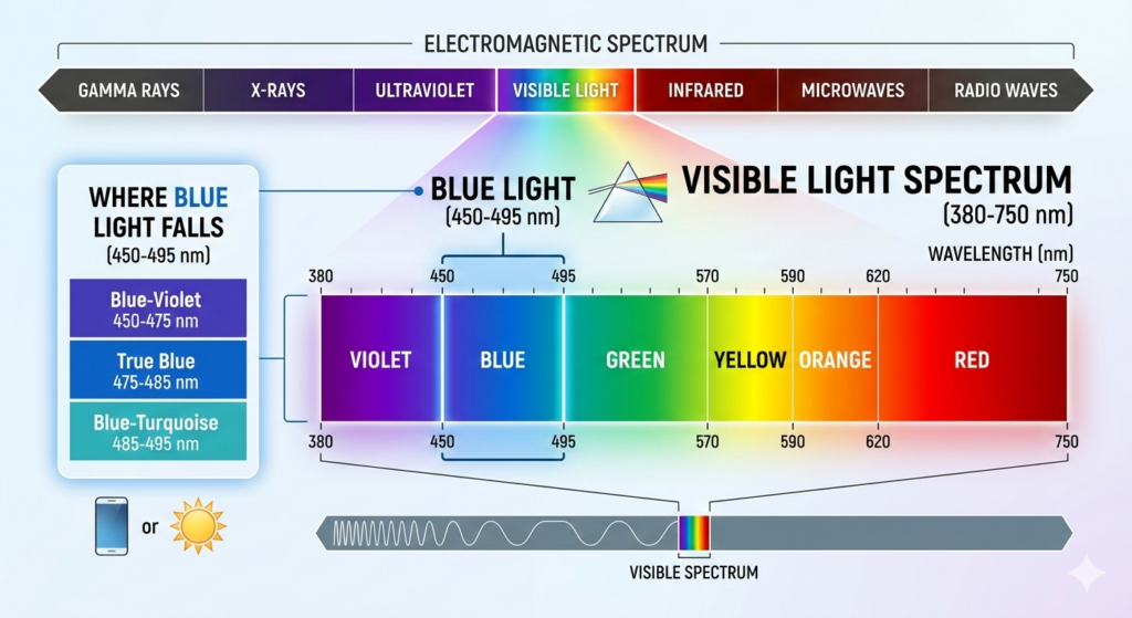 Screens emit blue-violet light, which is part of the visible light spectrum. This light scatters more than other wavelengths and may contribute to visual discomfort in some people, especially in low-light or nighttime use.