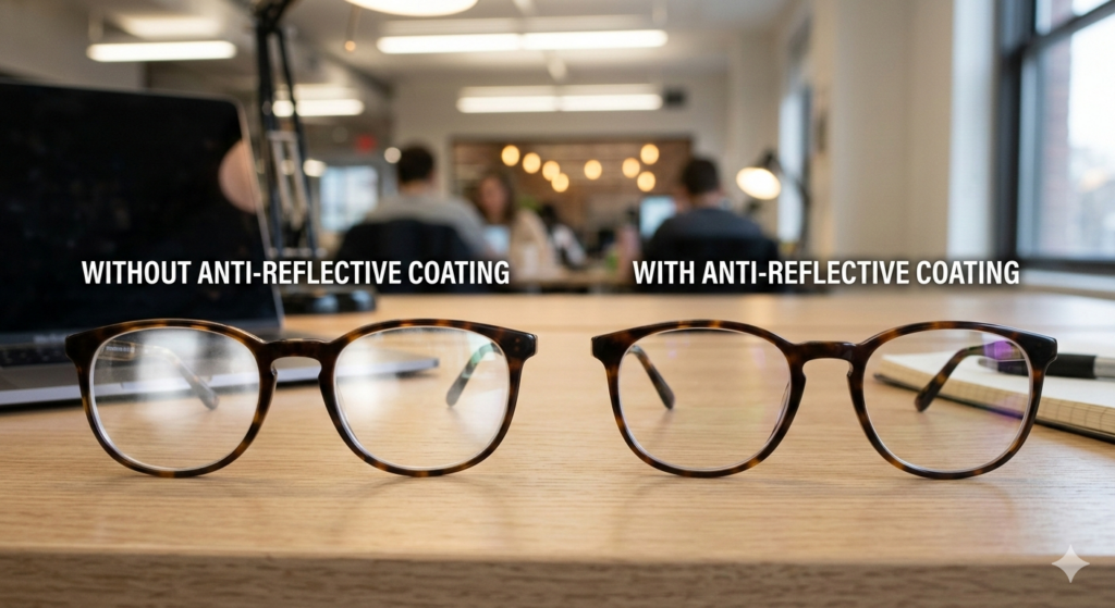 AR coating reduces reflections from both the front and back surfaces of your lenses. Without it, light from screens, ceiling lights, and windows bounces off your lenses and enters your eyes as glare.